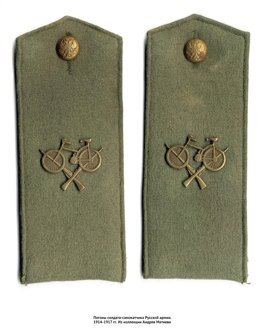 Велосипеды в начале войны использовали французские – системы Жерара, складные, образца девяностых годов XIX века. В сложенном состоянии их крепили на спину ремнями. К 1916 году на вооружение поступили русские складные велосипеды заводов Дунга и Лейтнера – одни из лучших в своём классе.