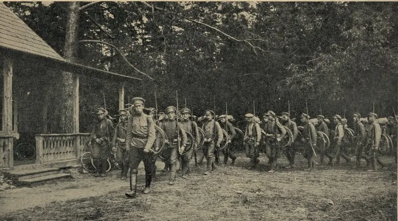 Август 1915 года. Русская армия отступает. 3-я самокатная рота прикрывает отход пехотных частей из Вильно в Молодечно, затем в Минск. Отступающие проходят по сорок вёрст в сутки – и то с трудом из-за дождей и раскисших дорог. Сто семьдесят пять вёрст от Вильно до Минска велосипедисты преодолели за четыре дня. Скорость составила пять-восемь вёрст в час – погода и состояние дорог сказались.