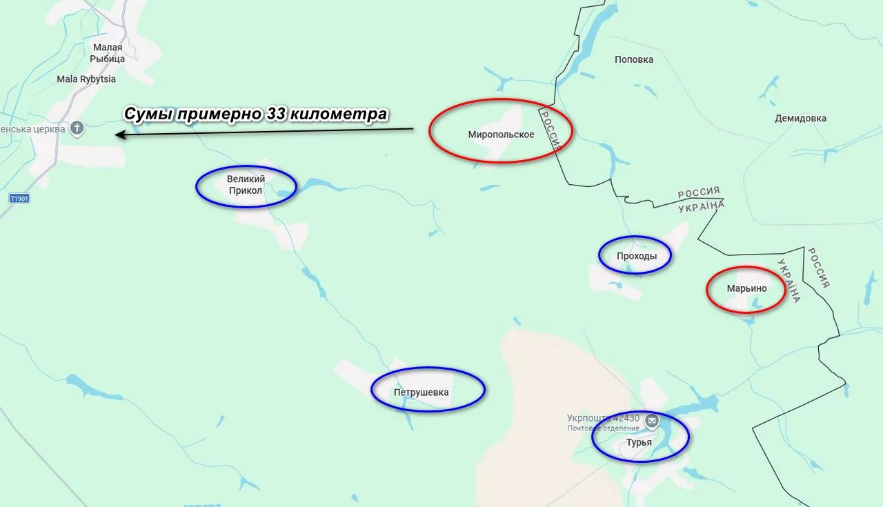 Таким образом, в Краснопольском районе Сумской области под контроль ВС РФ перешло уже второе село, первым было Марьино, расположенное восточнее Миропольского. В дальнейшем, судя по карте, у наших задачи освободить села Проход и Великий Прикол.