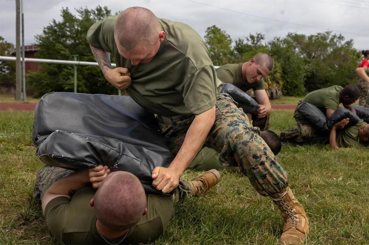 Так, в рамках тренировочного комплекса на острове Паррис в штате Южная Каролина среди испытаний – спарринги через гимнастические маты. В ходе этих спаррингов тот боец, который выступает в роли атакующего, должен всей своей массой навалиться на защищающегося, нанося при этом удары в полную силу, но не по телу, а именно по гимнастическому мату. Обороняющийся должен сгруппироваться так, чтобы выдерживать атаку и, по возможности, перехватить инициативу.