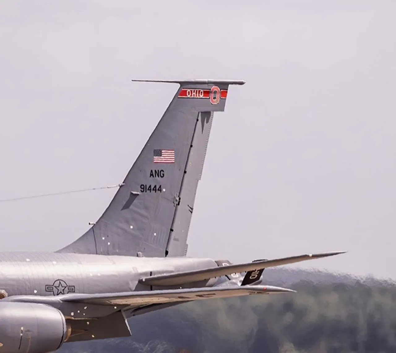 Как видно по надписи на самолёте, принадлежит он авиакрылу ВВС США в штате Огайо. Это первое подобного рода повреждение авиатанкера США за последние годы Как видно, заплатки пришлось накладывать фактически по всей длине фюзеляжа.