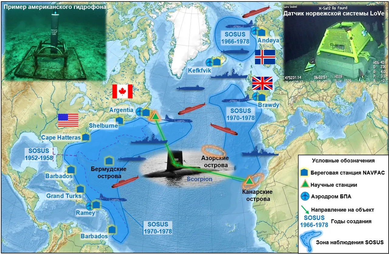 Зоны подводного наблюдения системы SOSUS на Атлантике к концу 1970-х годов. Коллаж zvezdaweekly.ru