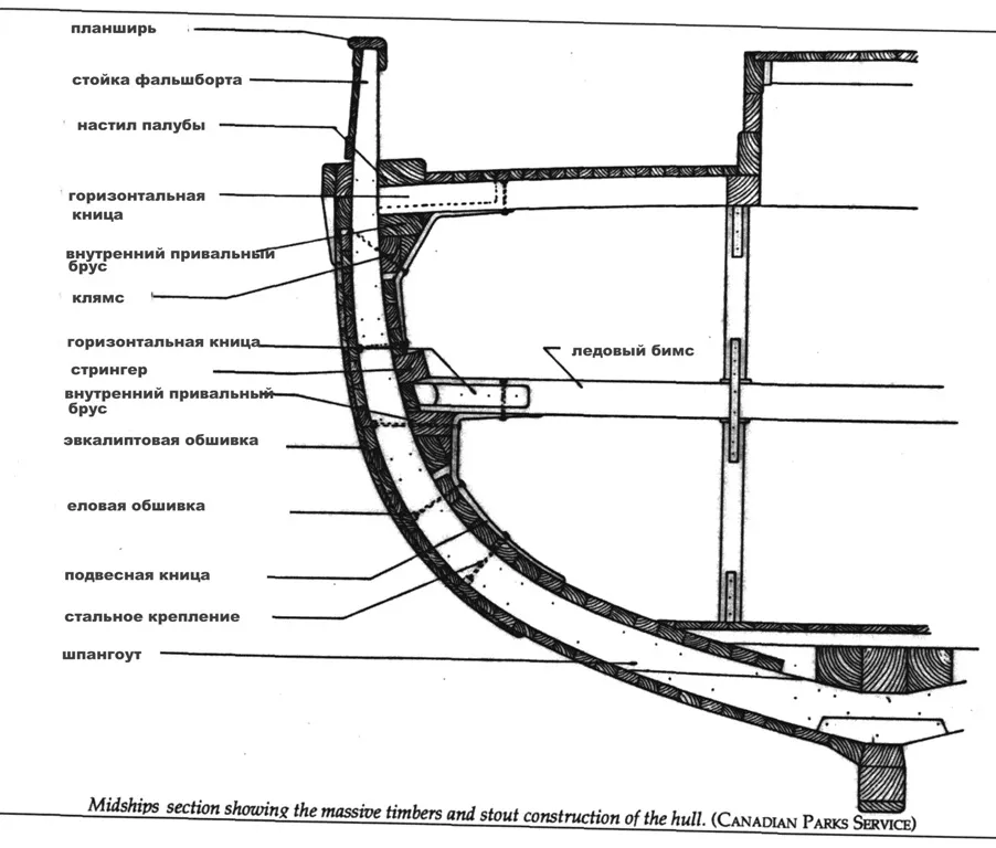 Киль сечением 292 х 356 мм, форштевень (254 х 406) и старнпост (279 х 381), а также некоторые другие части корпуса были изготовлены из отличающегося особой твердостью и смолистостью разновидности австралийского эвкалипта (ironbark или Australian gumwood). Настил палубы из еловых досок толщиной 76 и шириной 165 мм крепился к бимсам оцинкованными винтами. Снаружи корпус обшит эвкалиптовыми досками толщиной 38 мм для защиты еловой обшивки от повреждения льдом. Между этими досками имеется небольшой зазор, что позволяло морской воде проникать к еловой обшивке и тем самым предотвращать ее сухое гниение.