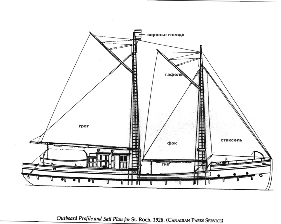 «St. Roch» несла вспомогательное парусное вооружение двухмачтовой гафельной шхуны с тремя парусами: фоком (fore sail), площадью 830 квадратных футов (около 77,1 м²), гротом (main sail), площадью 1185 квадратных футов (110,1 м²) и стакселем (stay sail или “jumbo”) — 420 кв. футов (39 м²). Высота фок-мачты составляла около 17 метров, грот-мачты — 19 метров. Стоячий такелаж стальной, бегучий изготовлен из пеньки. На топе грот-мачты было подвешено «воронье гнездо» («ice-bucket») для впередсмотрящего.