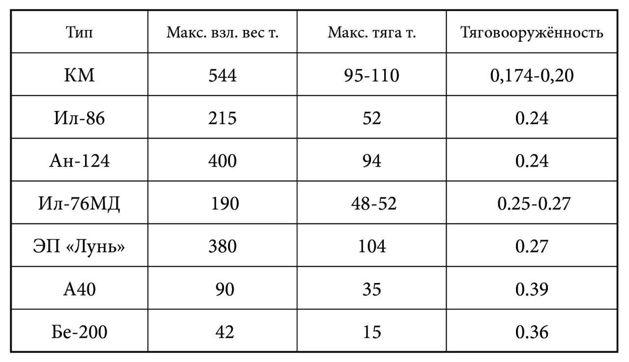 При всём этом ЭП «Лунь» имел вполне сопоставимую тяговооружённость с транспортными и пассажирскими самолётами того времени — 104 тонны тяги на 380 тонн максимальной взлётной массы. Ил-86, например, — 52 на 215, Ил-76МД — 48–52 на 190, а Ан-124 с весьма недешёвыми и хлопотными Д-18Т — 94 на 400. И, кстати, меньшую, чем у гидросамолётов: А-40 — 35 на 90 и Бе-200 — 15 на 42.