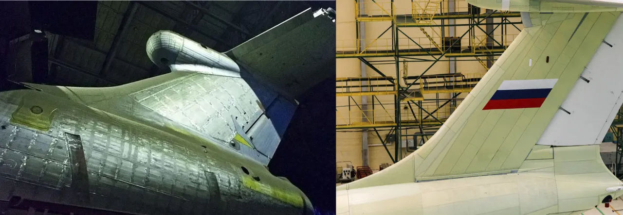 Теперь о конструкции, начну с крыла, размах и площадь которого 44 м и 500 (550 в некоторых источниках (н.и.)) кв. м у ЭП «Лунь» и 50,5 м и 300 кв. м у Ил-76 соответственно.