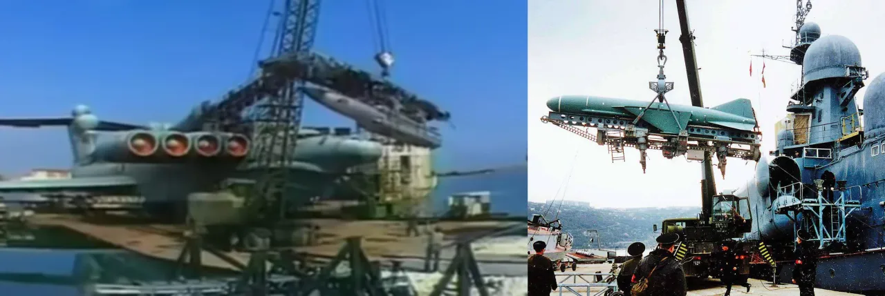 Погрузка ракет колёсным краном (предположительно К-255) окончательно развеивает сомнения в обычных условиях для базирования МРК типа «Лунь». «Москит» не «Термит», но и К-255 не КС-2573 (предположительно)