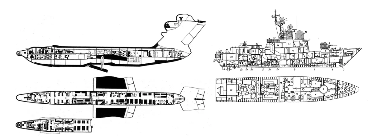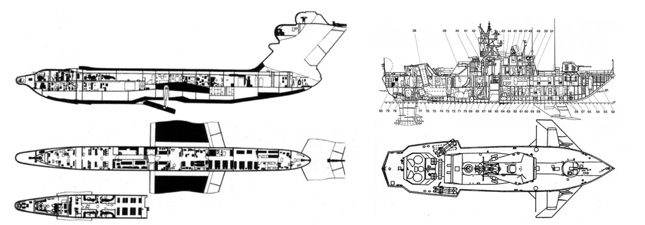 Что с трудоёмкостью? Грубо — корпус ЭП примерно соответствует по сложности изготовления корпусу равноразмерного надводного корабля, разделён на отсеки несколькими переборками и двумя палубами, и по сравнению с кораблём, можно сказать, пуст. Двигатели, вооружение и топливо вынесены наружу: в пилоны, на крышу корпуса и в крылья, внутри только малочисленный (11-12 человек) экипаж, посты управления, РЭО и вспомогательные агрегаты.