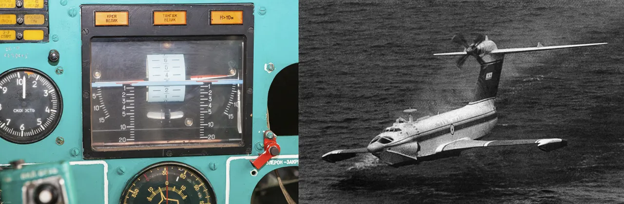 Фото «Луня» в развороте нет, поэтому вот фото накренившегося «Орлёнка». Зато есть фото индикатора крена, тангажа и скольжения с приборной доски «Луня». Заодно видим ужасный кильватерный след от пролёта ЭП (не видим)