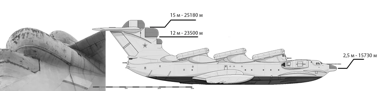 Соответственно, пикирующий момент может превратиться в кабрирующий, и экраноплан/экранолёт «повиснет» на хвосте и тяге двигателей. И вот чтобы экраноплан и дальше мог висеть на хвосте, не встав «свечой» и не рухнув, и нужен большой стабилизатор с эффективными рулями высоты, который будет создавать уже нормальную подъёмную силу, компенсируя кабрирование, т. е. обеспечивая нормальный аэродинамический общий фокус. В общем, большой стабилизатор нужен в основном для обеспечения нормального полёта вне экрана.