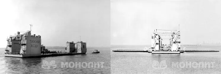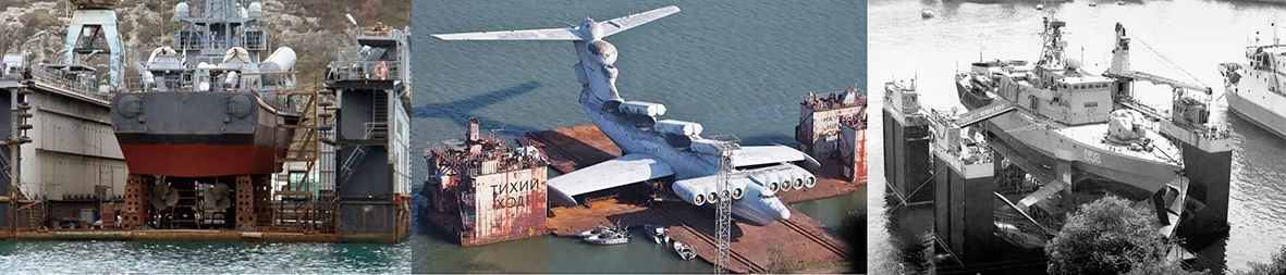 Действительно, для обслуживания ЭП «Лунь» создали малый плавдок проекта 18530: «…для докования экранопланов с целью их транспортировки, достройки, проведения испытаний и ремонта в процессе эксплуатации», не более. Сам док грузоподъёмностью 400 тонн, ему даже не всякий ракетный катер по силам, а крестообразность формировалась секциями, которые при необходимости отстыковывались.