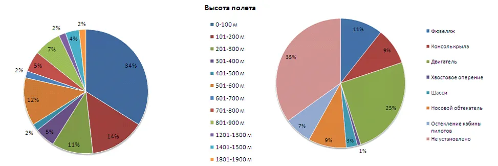 Основной процент установленных столкновений (34%) приходится на высоты 0-100 метров, а это, соответственно, взлёт, первоначальный набор высоты, заход на посадку, посадка — т. е. достаточно энергичные вертикальные манёвры. Полёт же на устоявшейся малой высоте в 10-20 (высота именно двигателей «Луня») метров составляет 10 процентов от диапазона риска.