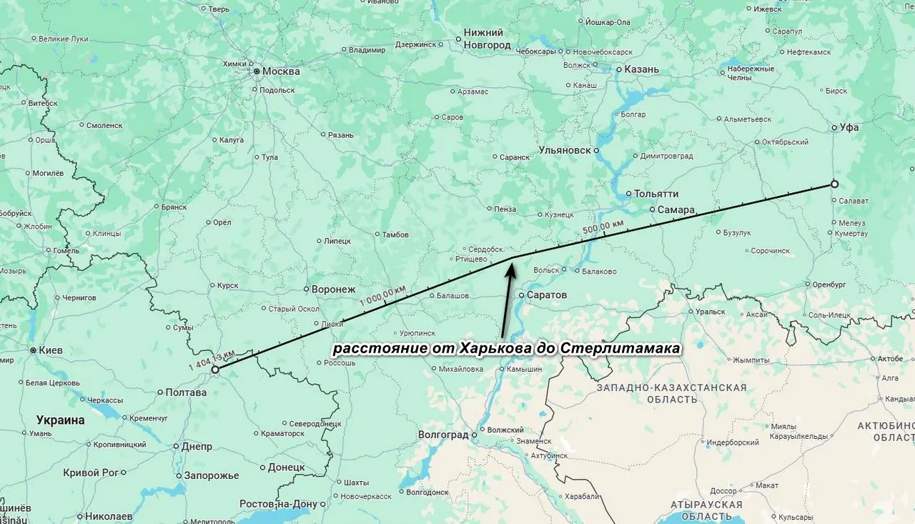 Отметим, что от подконтрольной Киеву территории до Стерлитамака украинским БПЛА пришлось преодолеть порядка 1,5 тысяч километров, пролетев над несколькими российскими регионами. Причем наверняка летели они не по прямой, обходя зоны ПВО. Если только они не были запущены с территории Казахстана. Там расстояние небольшое — пролететь над Оренбургской областью и уже в Башкирии.
