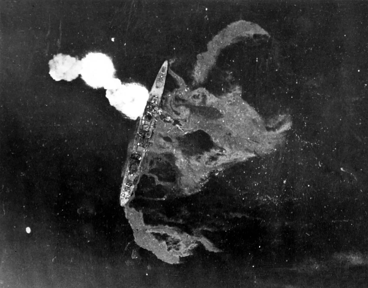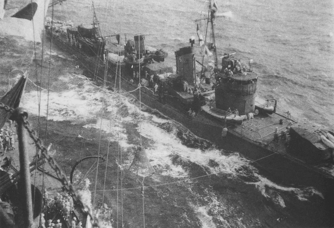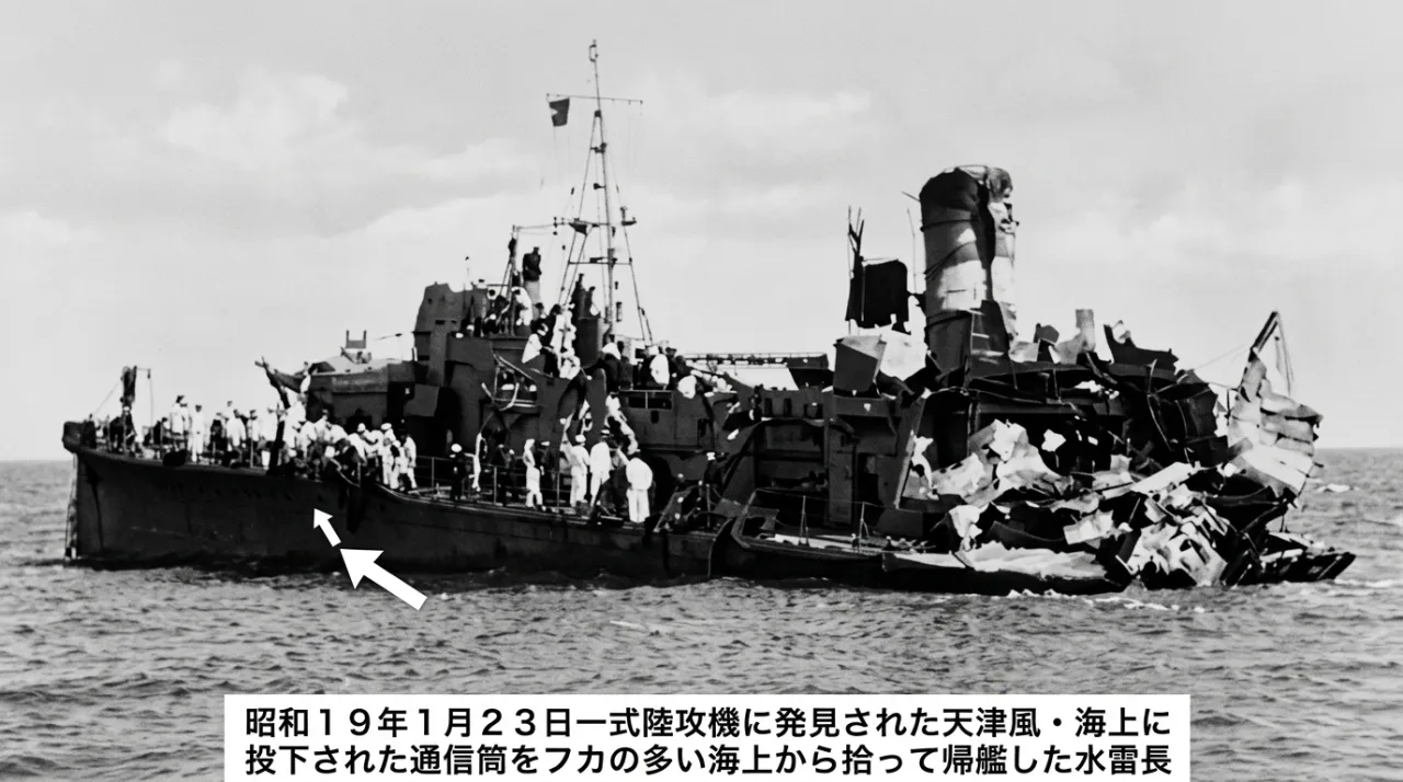 Подбитый «Аматсукадзе» после торпедирования «Редфином». Стрелка указывает на старшего торпедиста Эйдзи Маниву
