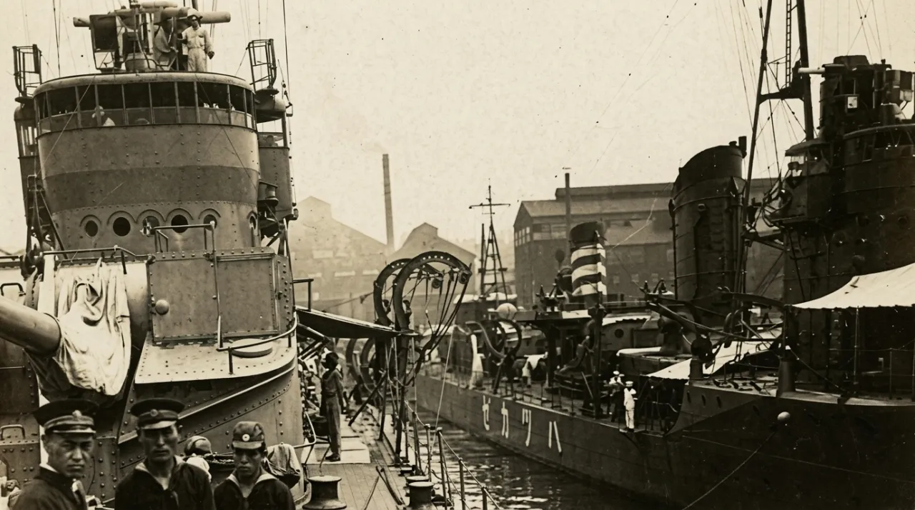 «Куросио» (вверху) и «Ширануи» (внизу) стоят на якоре у берегов Иокогамы во время смотра японского флота