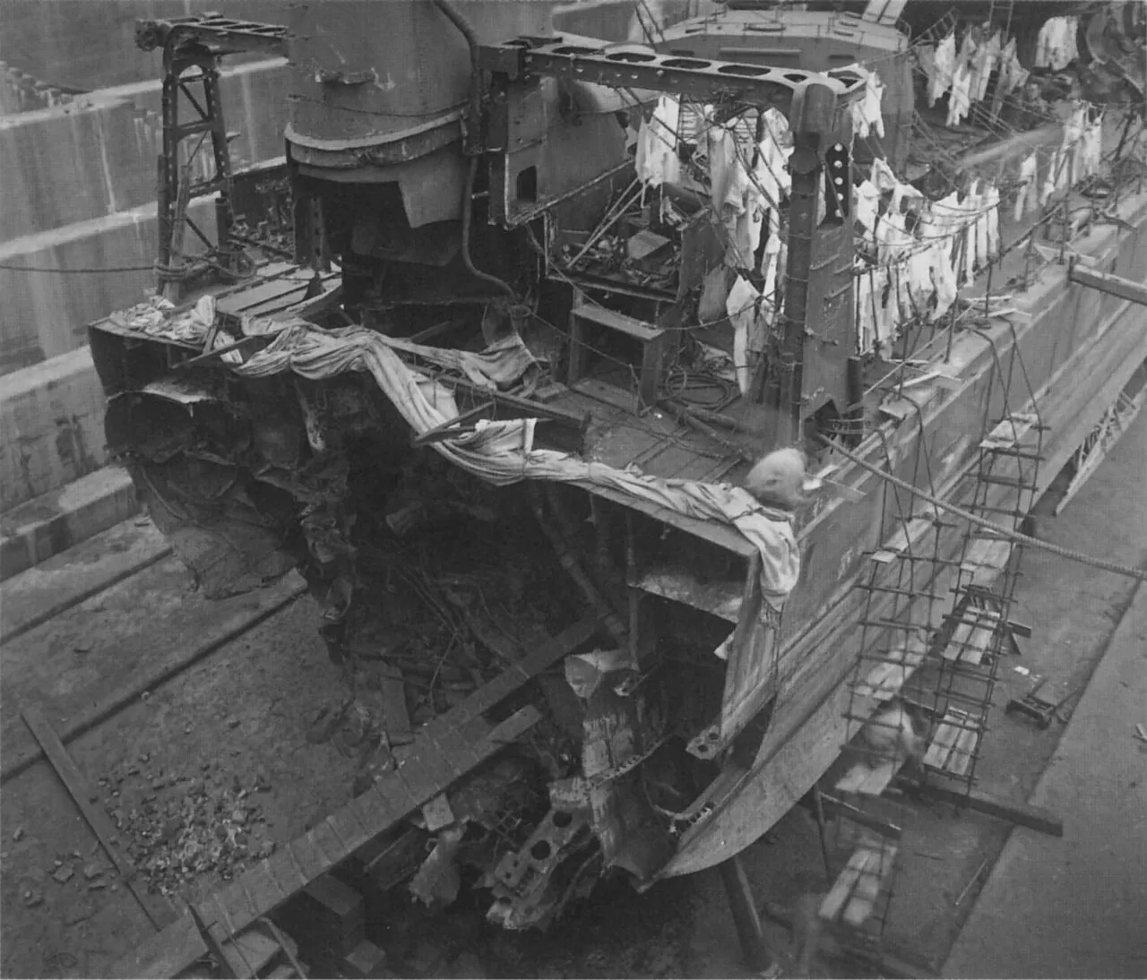 Последствия попадания бомбы, разрушившей кормовые башни «Аматсукадзе»
