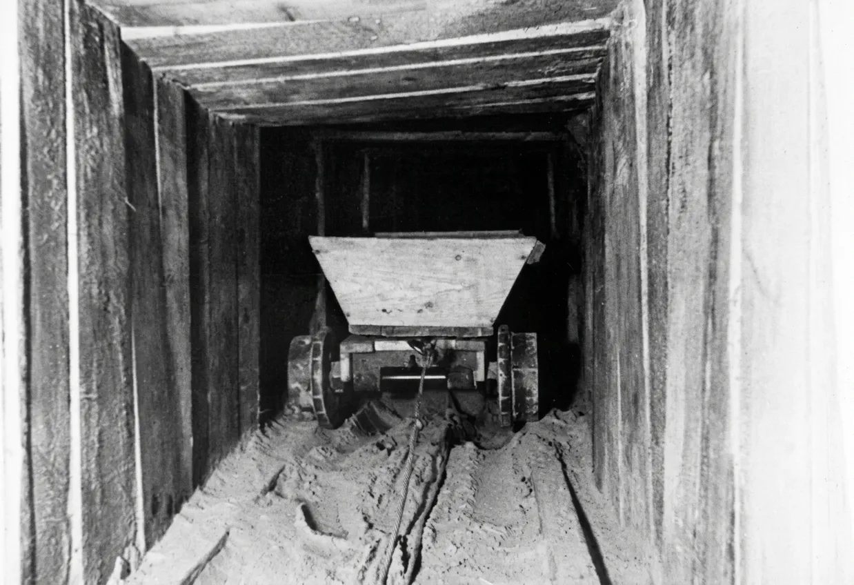 По тоннелю тянут деревянные рельсы, обшивают жестью. По ним бегает вагонетка она возит песок и потом людей. Тонны грунта выносятся наружу. Куда их девать? Тут в дело вступают «пингвины».