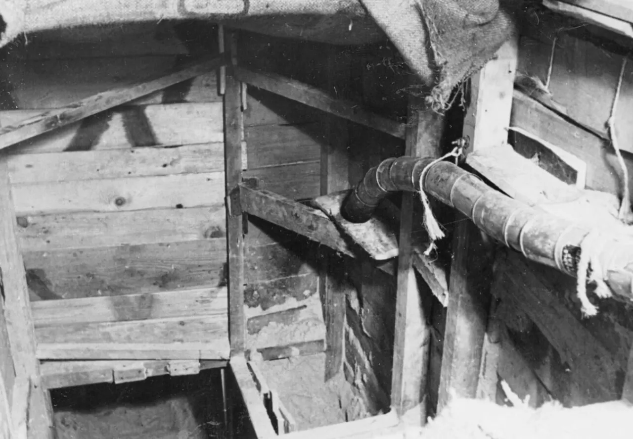 Стены и потолок обшивают досками. Доски вытаскивают из кроватей. Вытащили рейку поставили подпорку из подручного материала. За время работ ушло больше четырёх тысяч досок. Без обшивки тоннель сложился бы в первый же день.
