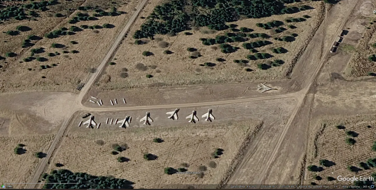 Спутниковый снимок Google Earth: самолёты-мишени на бутафорском «Аэродроме Камбрия». Снимок сделан в апреле 2025 года
