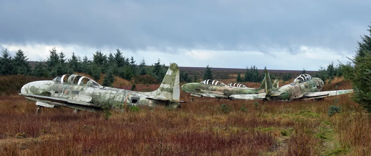 Вокруг нескольких уцелевших реактивных учебно-тренировочных самолётов Lockheed Т-33А Shooting Star сильно разросся кустарник и разнотравье.