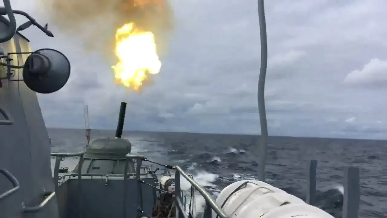 30-мм установка АК-630 ведёт огонь по воздушной мишени
