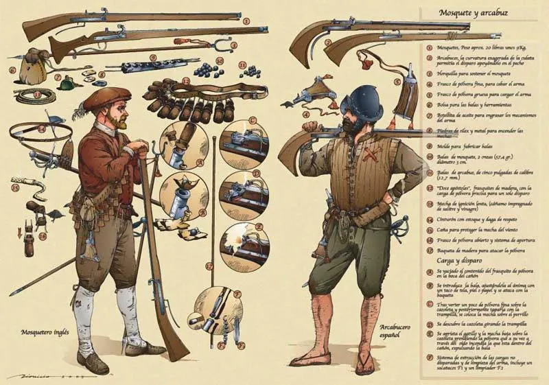 Снаряжение и вооружение пехотинцев конца XVI века: английского мушкетера (слева) и испанского аркебузира (справа)