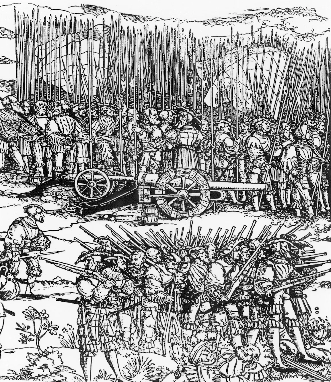Наёмники-аркебузиры вместе с поддерживающими их копейщиками готовятся к битве при Павии в 1525 году