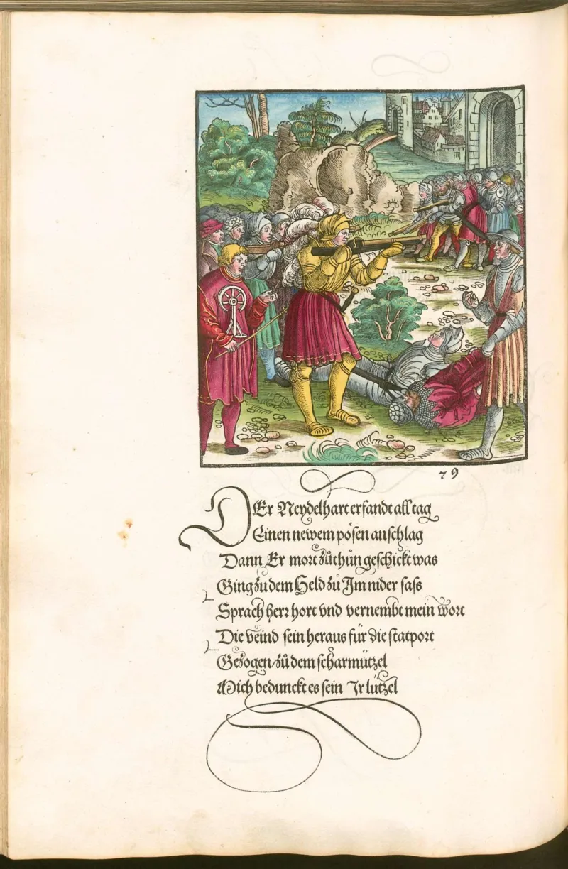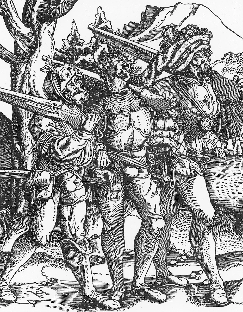 Трое немецких наёмников вооружены аркебузами. У солдата справа на шее висит пороховница