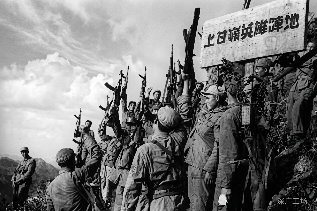 Бойцы Китайских народных добровольцев (КНД), празднующие победу в сражении при Треугольной горе (известном в Китае как битва за Шанганьлин) во время Корейской войны