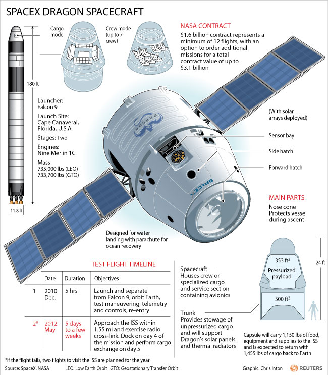 Первым космическим коммерческим кораблем в этой программе стал запущенный в космос Dragon, разработанный компанией SpaceX. В мае 2012 года он успешно доставил на МКС 500 кг полезных грузов. Специально для данного космического аппарата была создана ракета-носитель Falcon. 4 декабря 2013 года с космодрома, расположенного на мысе Канаверал, данная ракета успешно вывела на орбиту спутник связи. И хотя старт удалось осуществить только с третьей попытки, спутник был успешно выведен на земную орбиту. Главное же в этом событии заключается в том, что запуск американской ракеты Falcon обошелся на 30 млн. долларов дешевле, чем использование для этих целей российских «Протонов».