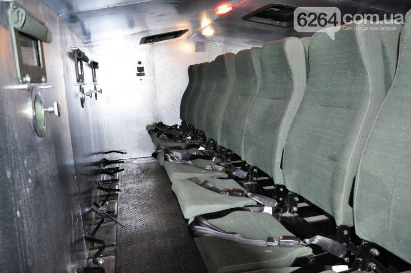 Внутри нет ни носилок, ни медаппаратуры, только два ряда кресел, бронированные оконца и бойницы под ними.