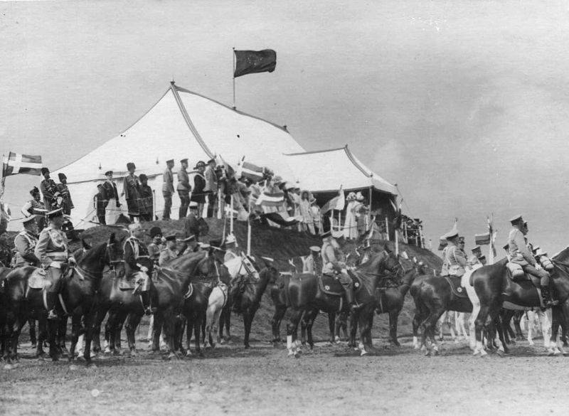 31. Император Николай II и датский король Фридрих VIII со свитой на военном поле. 7 июля 1909
