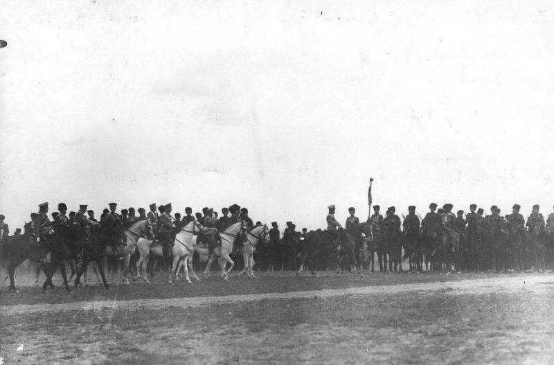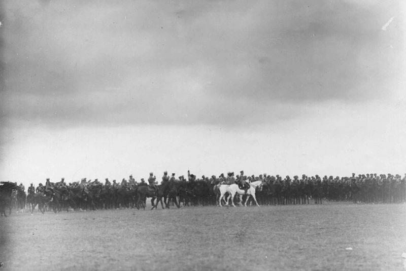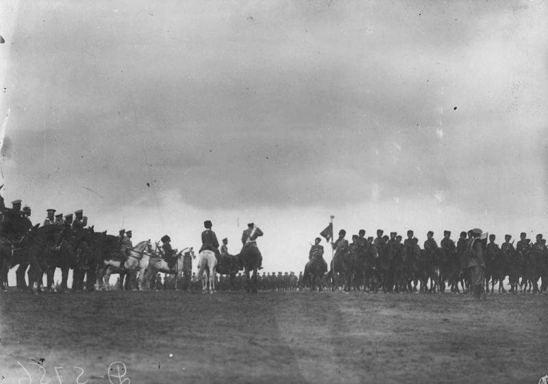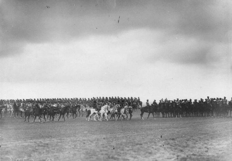 17. Кавалерийские части проходят маршем мимо императора Николая II на параде войск лагерного сбора. 30 июля 1912