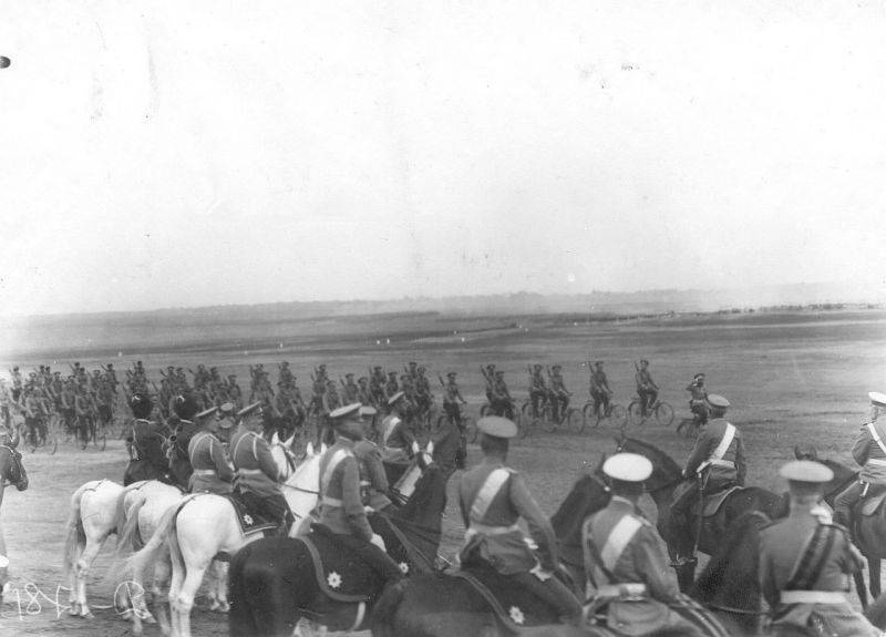 08. Самокатчики проезжают мимо императора Николая II и его свиты на лагерном сборе войск. 25 июля 1913