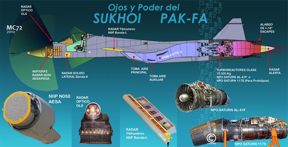 Концерн «Радиоэлектронные технологии» (КРЭТ) ведет разработку прицельно-навигационного комплекса и другого бортового радиоэлектронного оборудования Т-50. Наконец, самое пристальное внимание уделяется и разработке для новой платформы новых современных авиационных средств поражения. При этом речь идет не просто о создании нескольких новых ракет, а целого комплекса средств АСП, которые должны быть готовы к принятию на вооружение одновременно с окончанием испытаний самого носителя. Таким образом, чуть ли не впервые в советской/российской практике процесс создания истребителя и оружия для него синхронизирован. Сами новые ракеты должны отличаться от предыдущего поколения меньшими размерами для размещения внутри фюзеляжа самолета, повышенной дальностью, высокой маневренностью, всепогодностью, улучшенными головками самонаведения. Дальность некоторых изделий возрастет благодаря применению новых двигателей в 1,5 раза. За счет комплекса бортового оборудования обеспечивается значительное превосходство не только над самолетами поколения 4++ (Су-35 и Су-30СМ, Rafale, Eurofighter), но и над зарубежными аналогами пятого поколения (F-22 и F-35). Благодаря новой «начинке» ПАК ФА сможет на качественно новом уровне выполнять поставленные задачи, не достижимые до настоящего момента ни одним боевым авиационным комплексом такого класса.